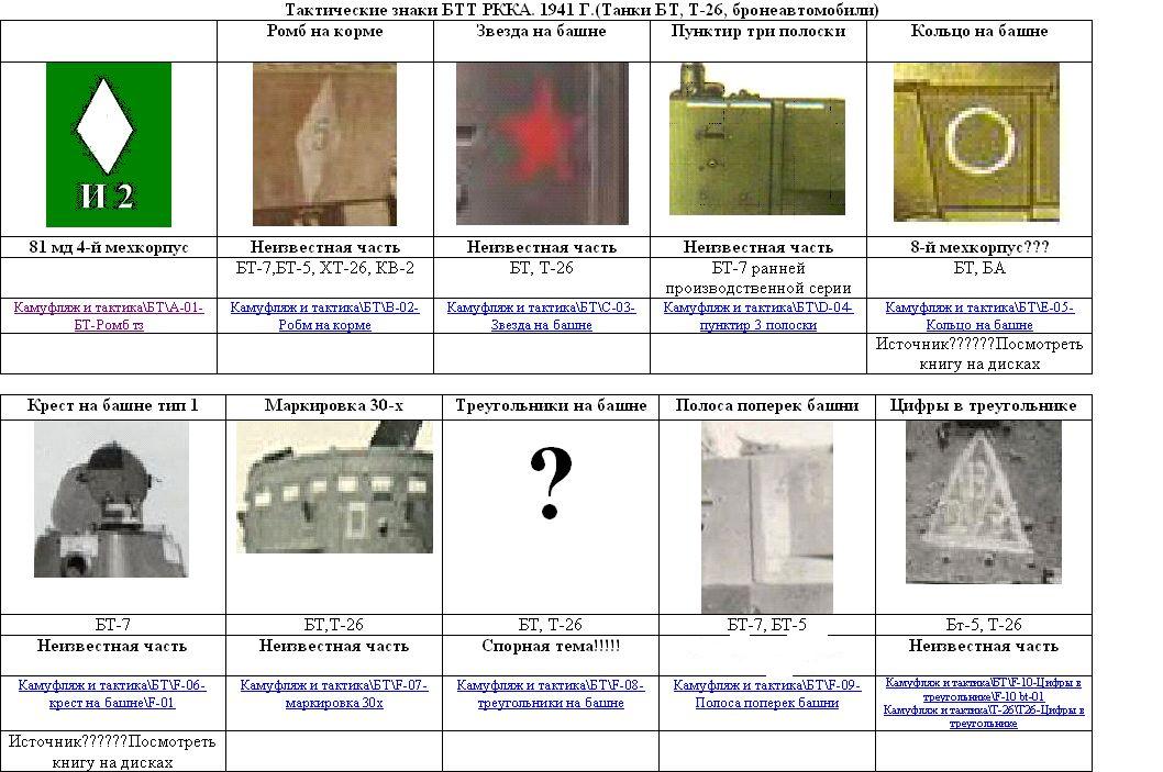 Попробовал сделать некую классификация по тактическим знакам и знакам воздушного опознования РККА на основе имеющихся фото периода лета-осени 1941, бронетехника-Т-26, БТ,БА.